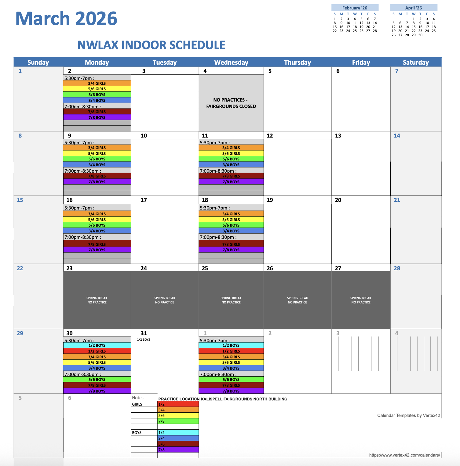 - Thursday 5:30pm – 7:00pm (With exception of NO practice on 3/4)